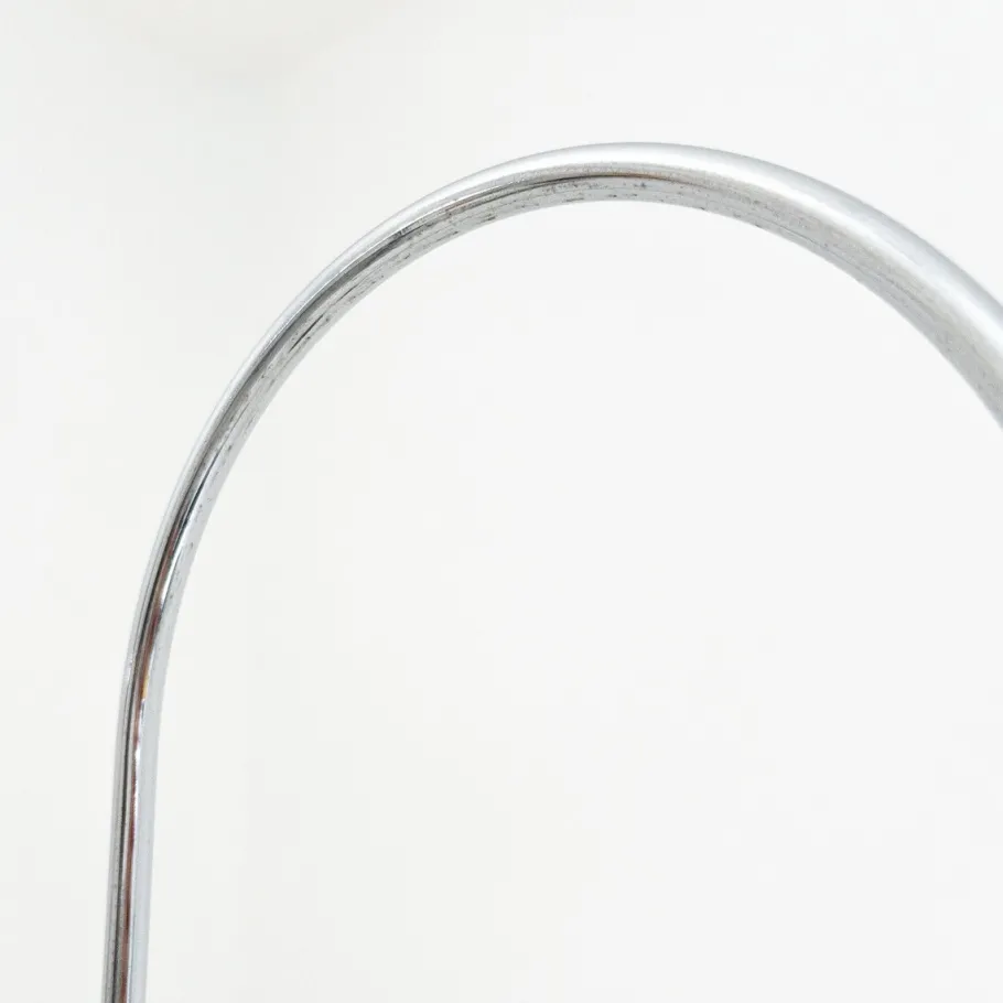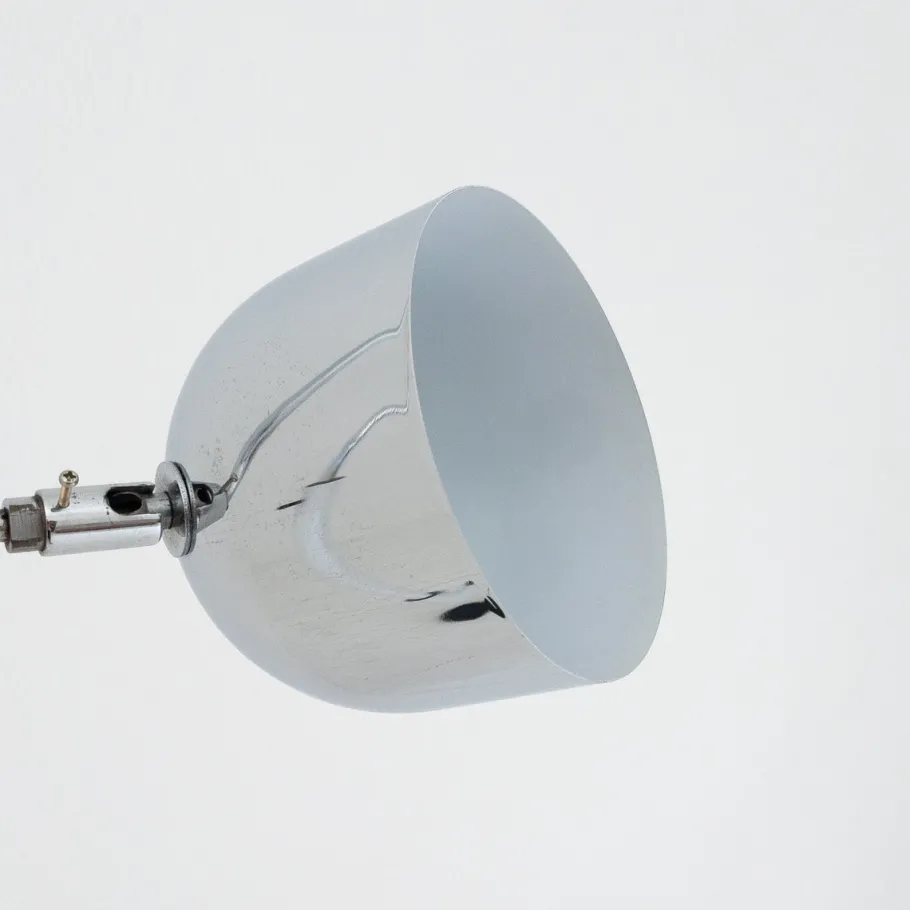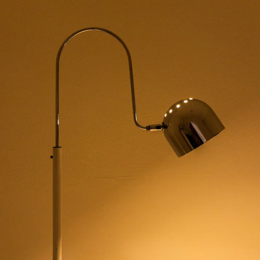 The diffuser, also in chromed metal, has a white interior which helps to diffuse a soft and uniform light into the surrounding environment. The lamp is turned on in a practical and intuitive way via a pedal, offering unparalleled ease of use.