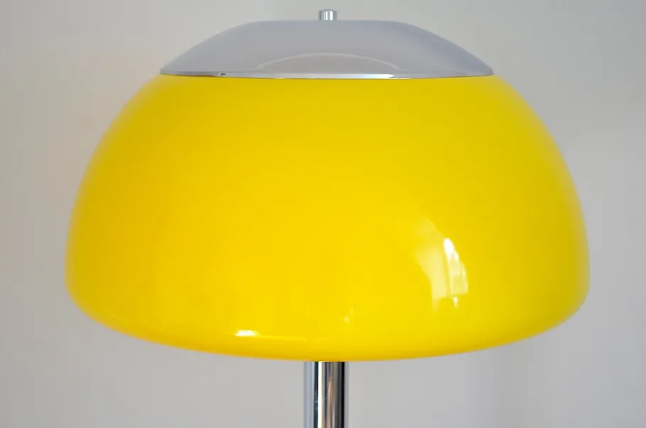 The floor lamp is very rare in this umbrella color and made of lemon yellow translucent plastic, white inside. The lampshade is mammed upwards and closes with a chrome plate, down the lampshade forms a stable wide -rolled edge – the base is stable and stable made of metal chrome -plated.
