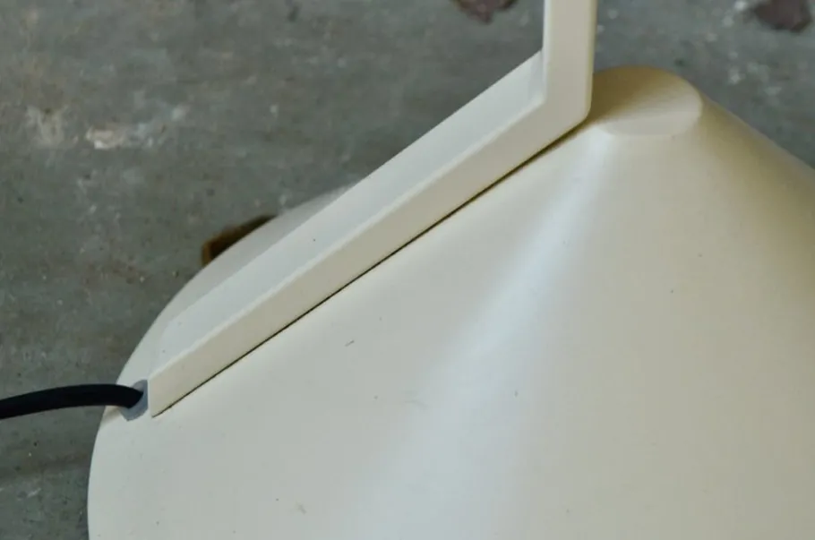 The Lamp 101/1 RL Relux Milano has a very typical design of the Italian productions of the 80s. It is made of beige metal, consisting of two cones bound by a tubular piece in a radical and minimal spirit. The lamp is functional, traces of use and light breaches are visible, especially on the lower part. The cache of the luminous intensity adjustment knob is missing, without it being harmful to its operation.