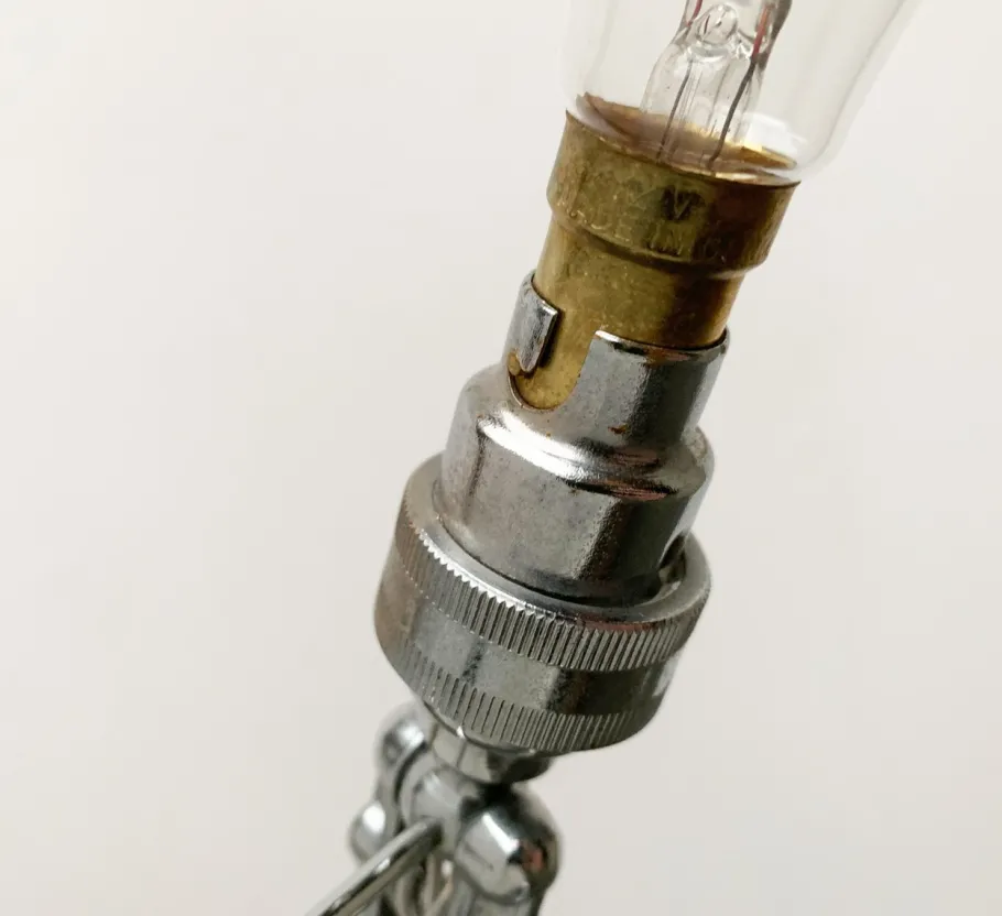A postmodern design with striking shapes. The finely executed shaft of the luminaire shows a uniform waveform. The foot forms a sharp cone that houses the transformer. At the top of the foot, the shaft is mounted over a joint that lets him tend to the front and back. At the upper the end of the shaft is an inconspicuous and “naked” bayonet. This is mounted with a ball joint on the shaft and can be adjusted with an integrated handle. In the style of the postmodern, the handle has a small, conical tip made of plastic. The lights are switched via a simple, technical toggle switch in the pedestal and have two brightness levels.