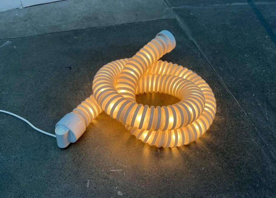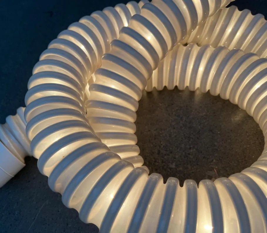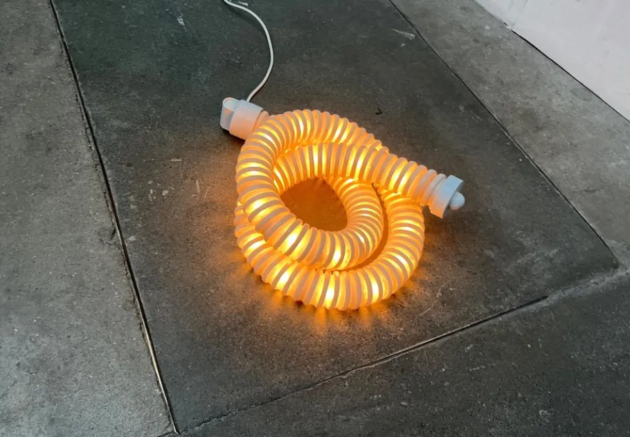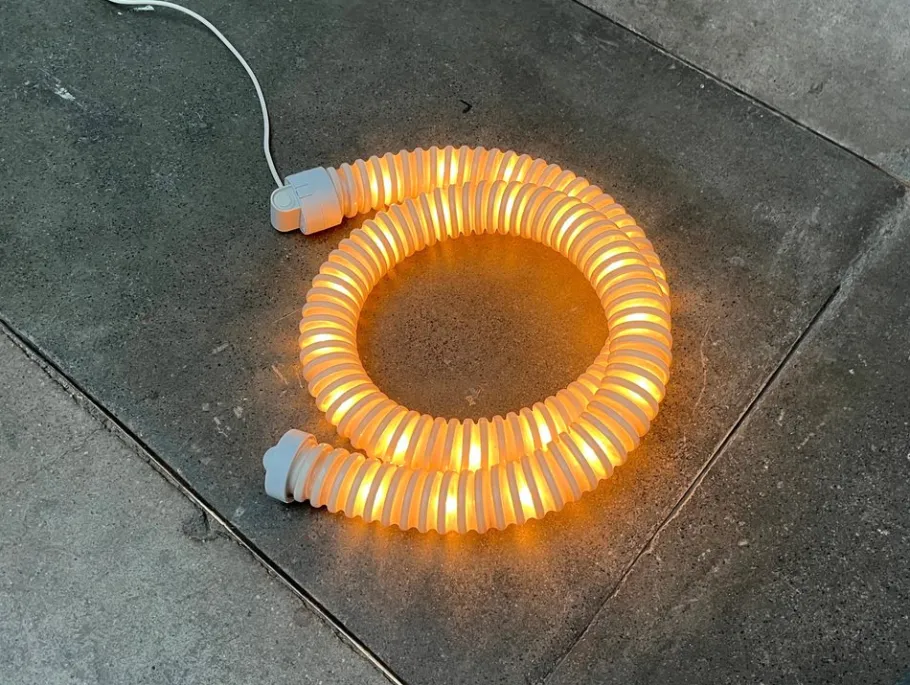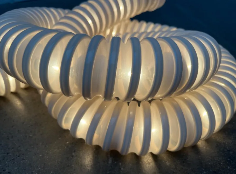A playful design and a classic of Italian design. The design is also described by the designers as a “serpent of endless light”. The lamp body consists of a transparent tube with a supporting structure. At one end there is an end piece with a switch and supply line. At the other end there is an end cap. Inside there is a flexible construction of lined up white balls with lights in between. The luminous snake can be freely draped, knotted, etc. and thus becomes a versatile luminous object.