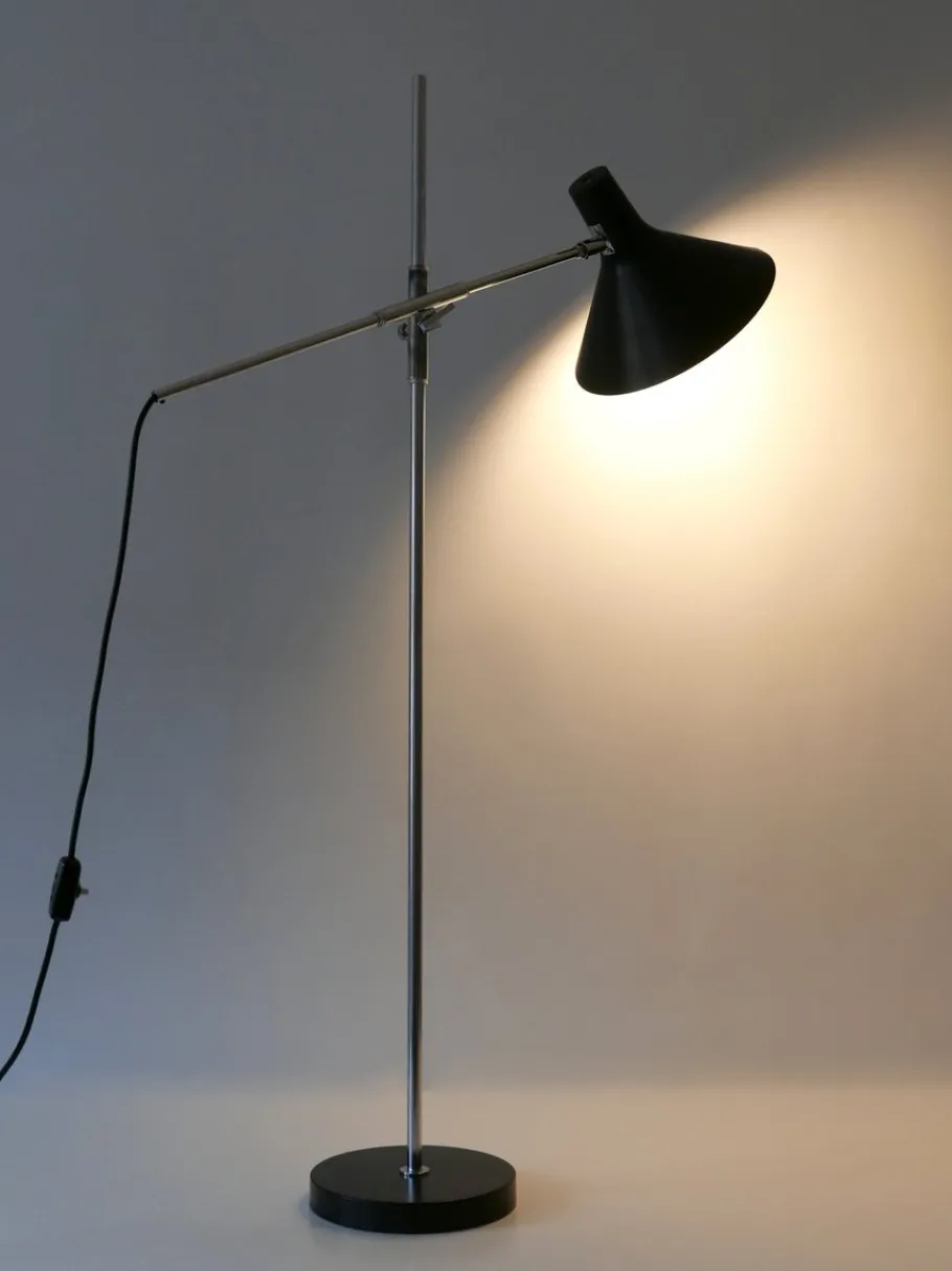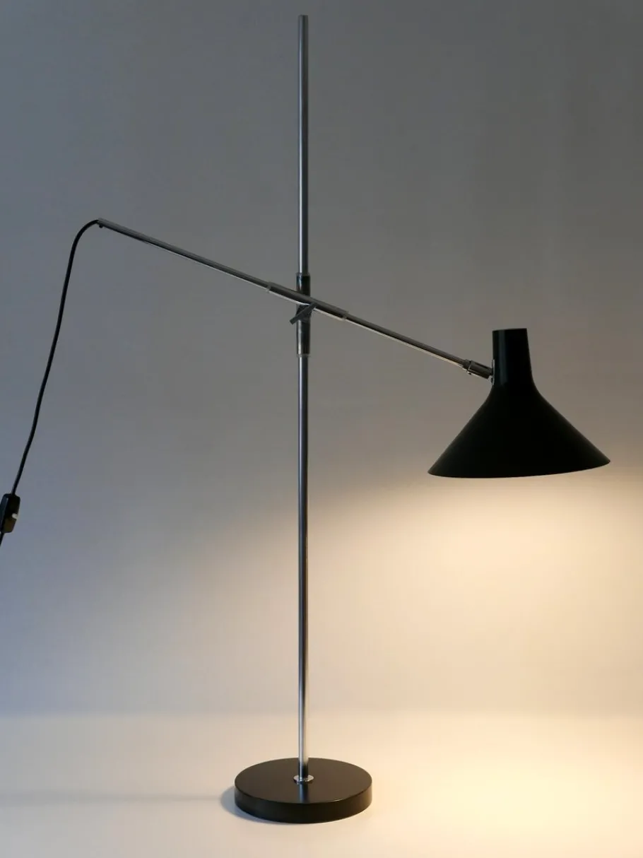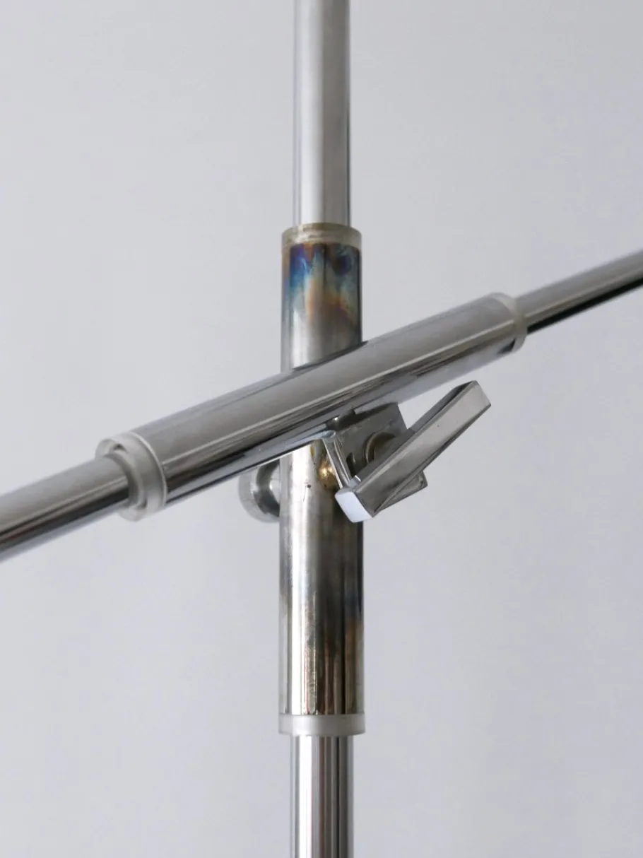 Executed in partly black enameled aluminium sheet and chrome-plated steel tubes, the lamp needs 1 x E27 / E26 Edison screw fit bulb, is wired, and in working condition. It runs both on 110 / 230 volt.