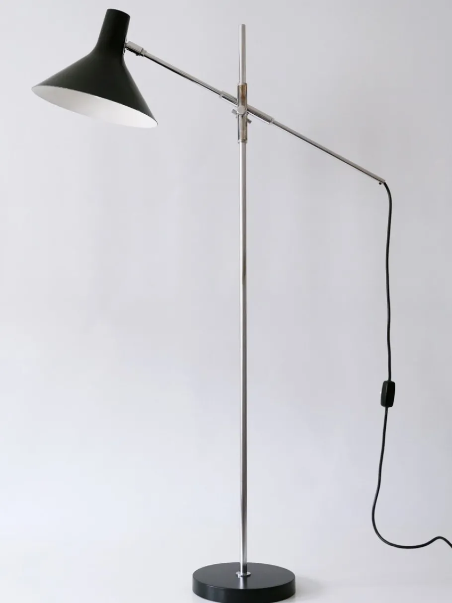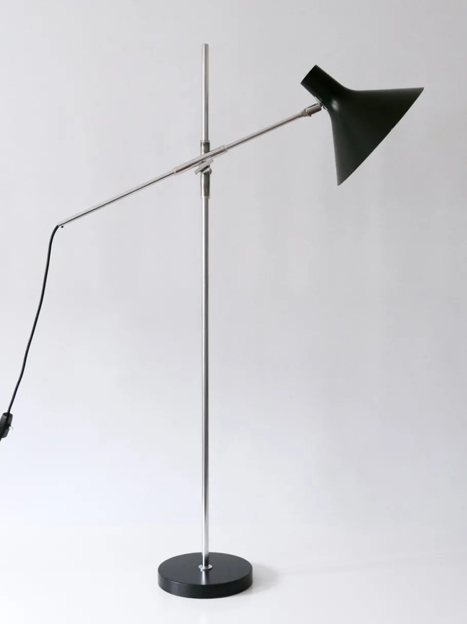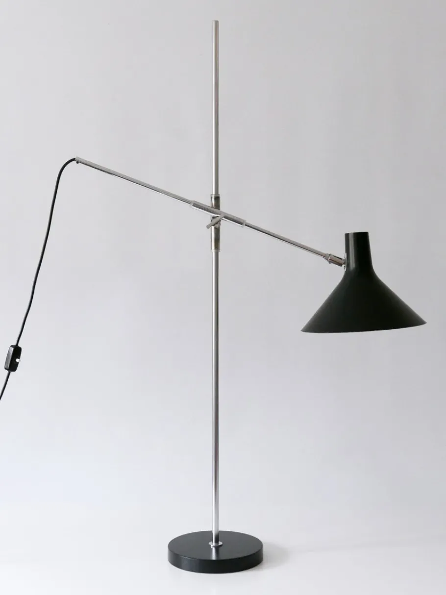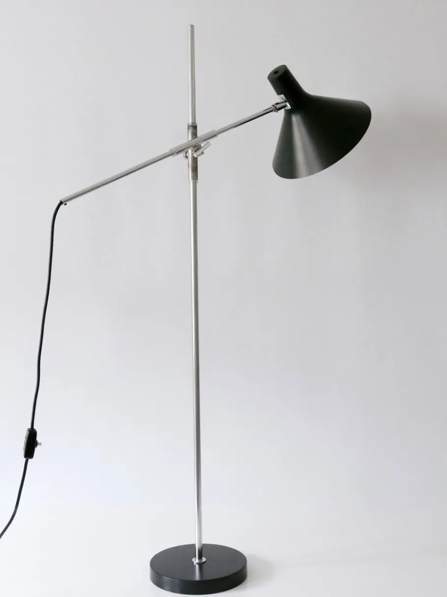 Executed in partly black enameled aluminium sheet and chrome-plated steel tubes, the lamp needs 1 x E27 / E26 Edison screw fit bulb, is wired, and in working condition. It runs both on 110 / 230 volt.