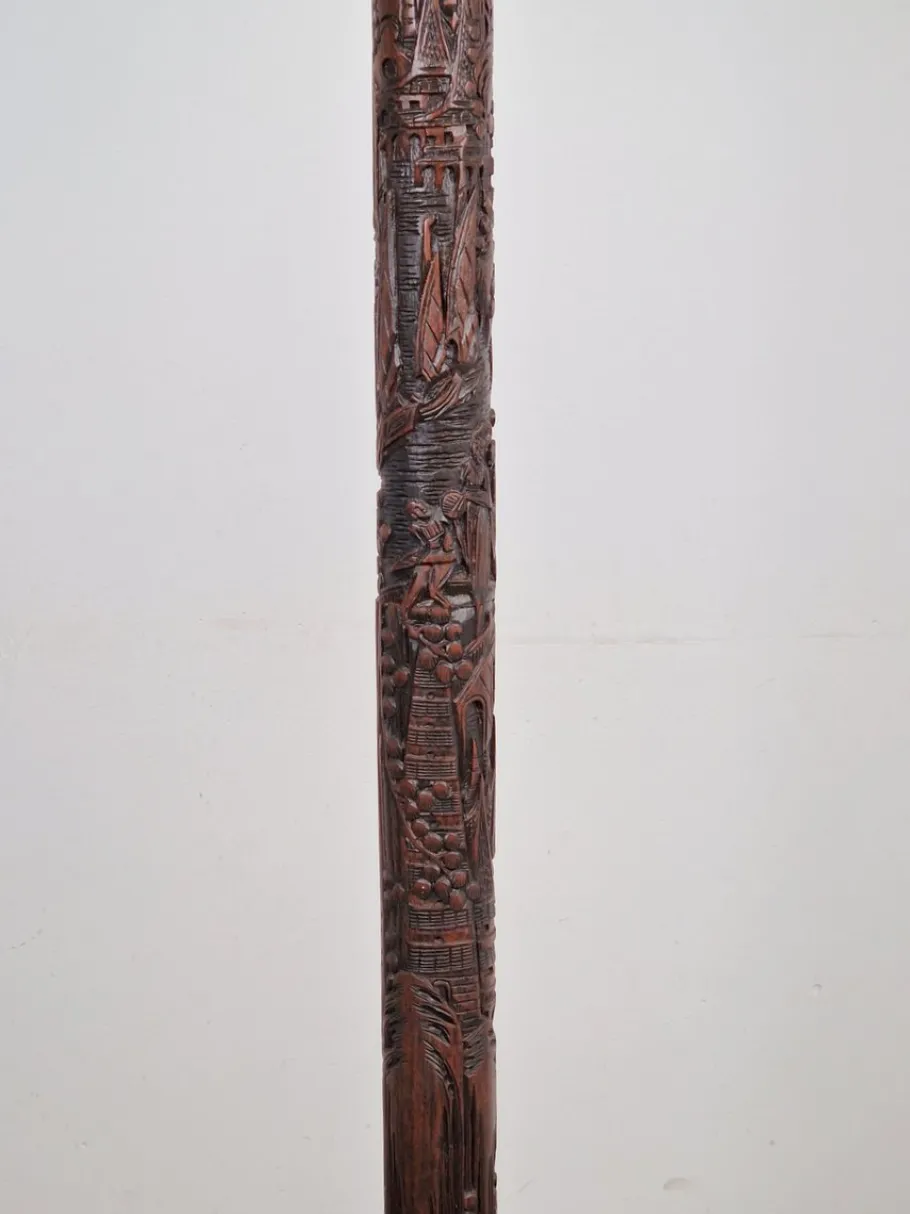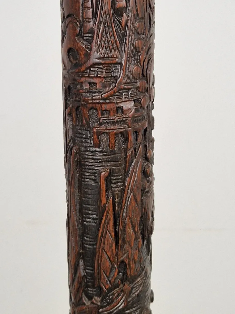 Very unique hand-carved mahogany floor lamp. Drawn in very fine detail with an oriental mythological scene. One of a kind.