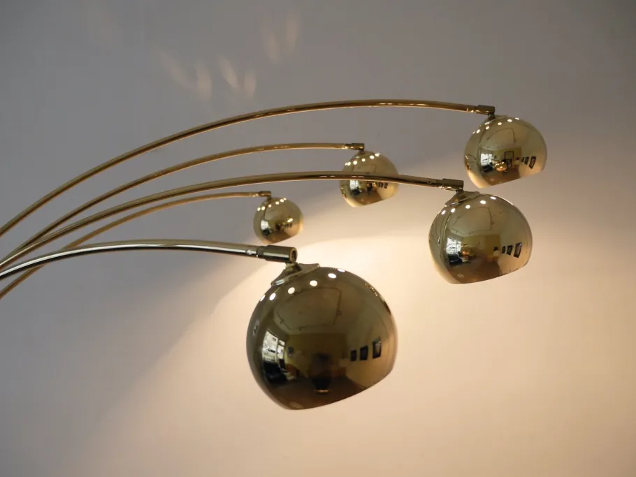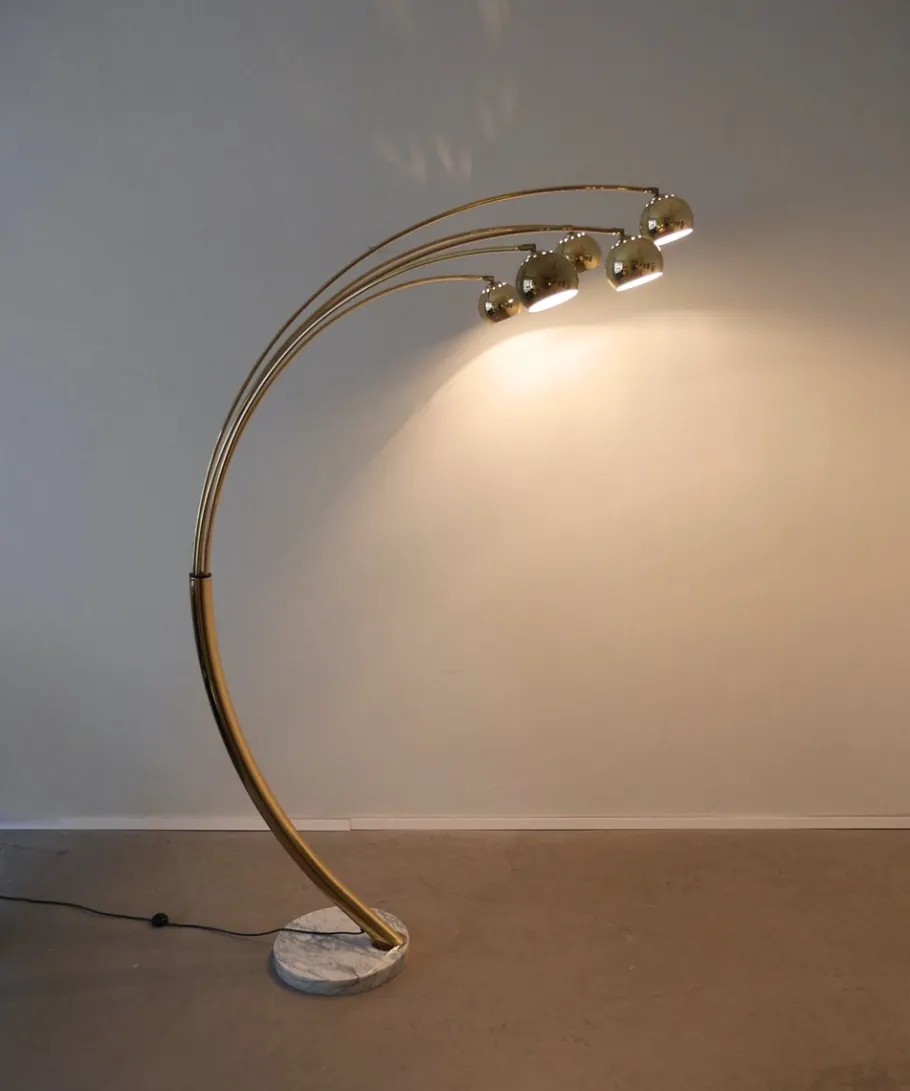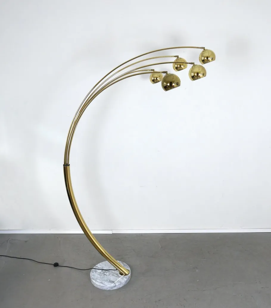 A large, round, white and solid Carrara marble base supports a curved brass column, which is divided upwards into five slender brass arches. Each bow can be swiveled to the right and left.