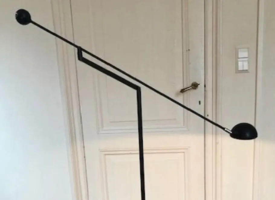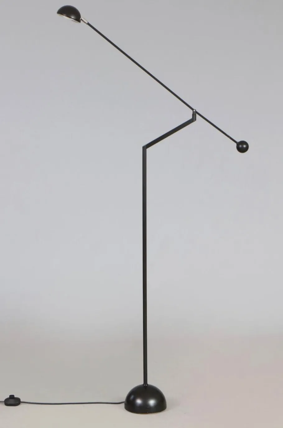 Black-painted metal, slim with joint arm, round luminous body with halogen lamps, round stand, met on the floor, H approx. 150cm (variable).