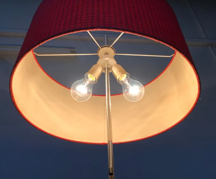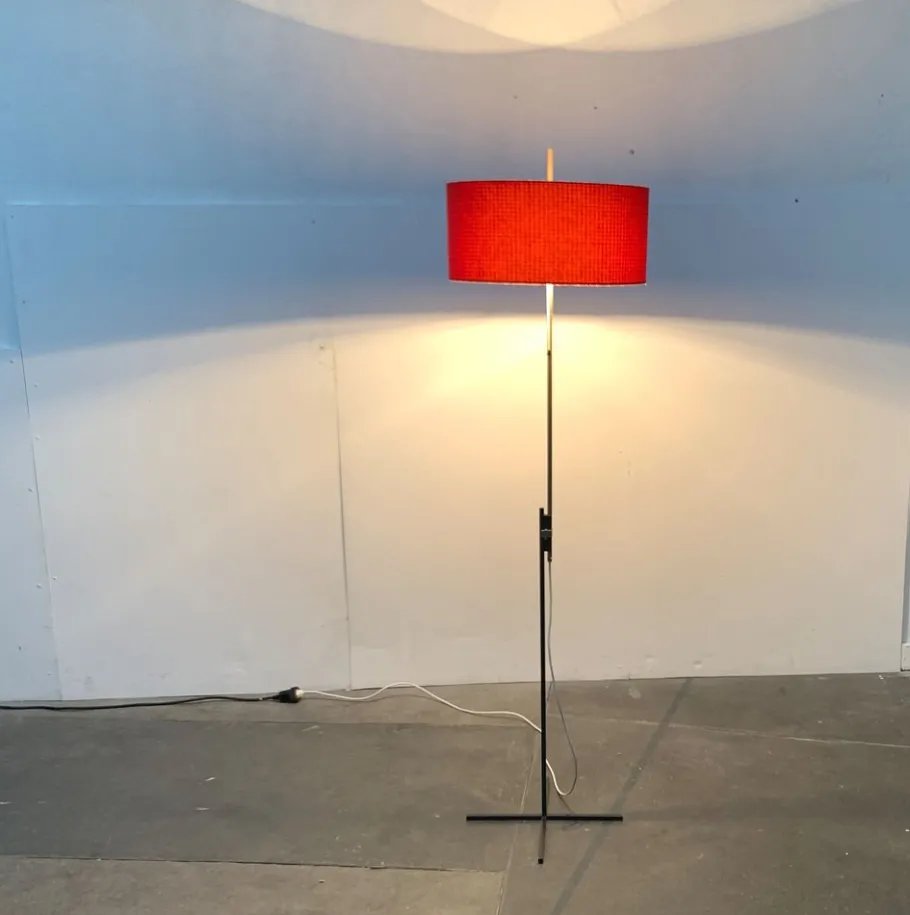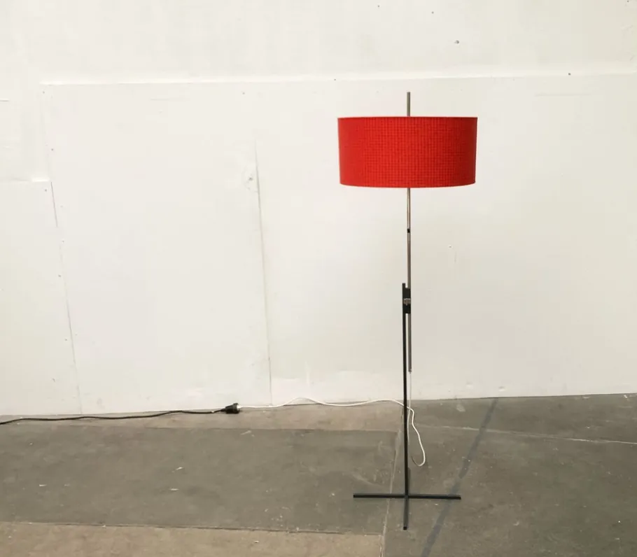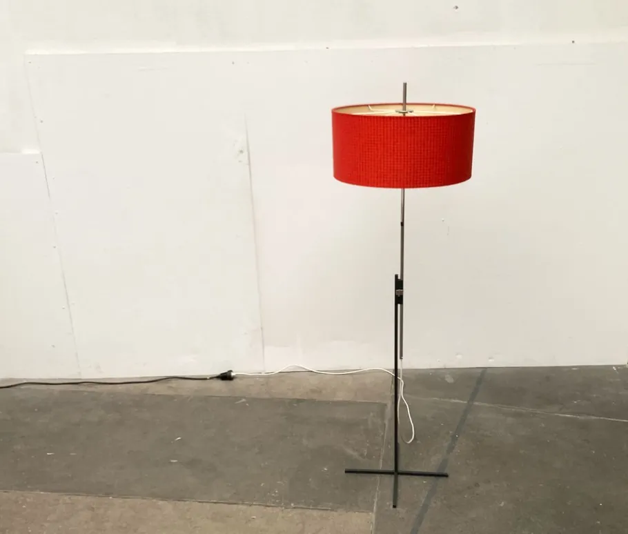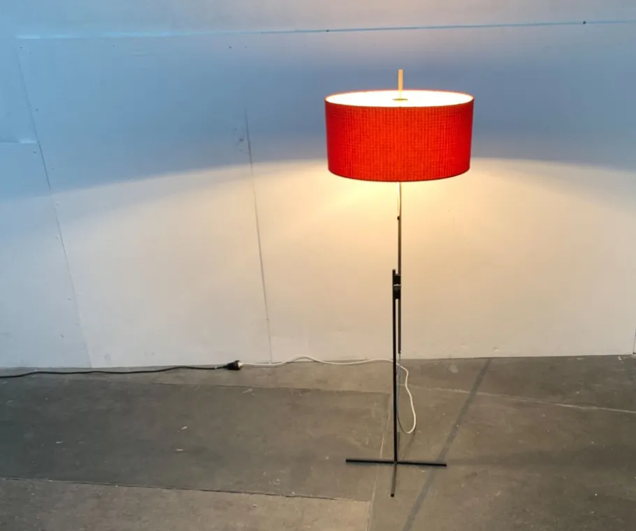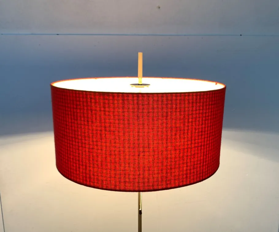 The special detail of this lamp is the simple, black star foot of square rods, which is hard to beat in terms of simplicity and simple elegance. Another detail is the height adjustment via a clamping mechanism with a lever. The shade can be moved up and down on the foot, which influences the lighting effect in the room. The light emanates primarily down and up. The large, original shade with the subtle check pattern on a red surface is special. The shade is lined with cardboard as a diffuser inside. The lamp has a pull cord as a switch.