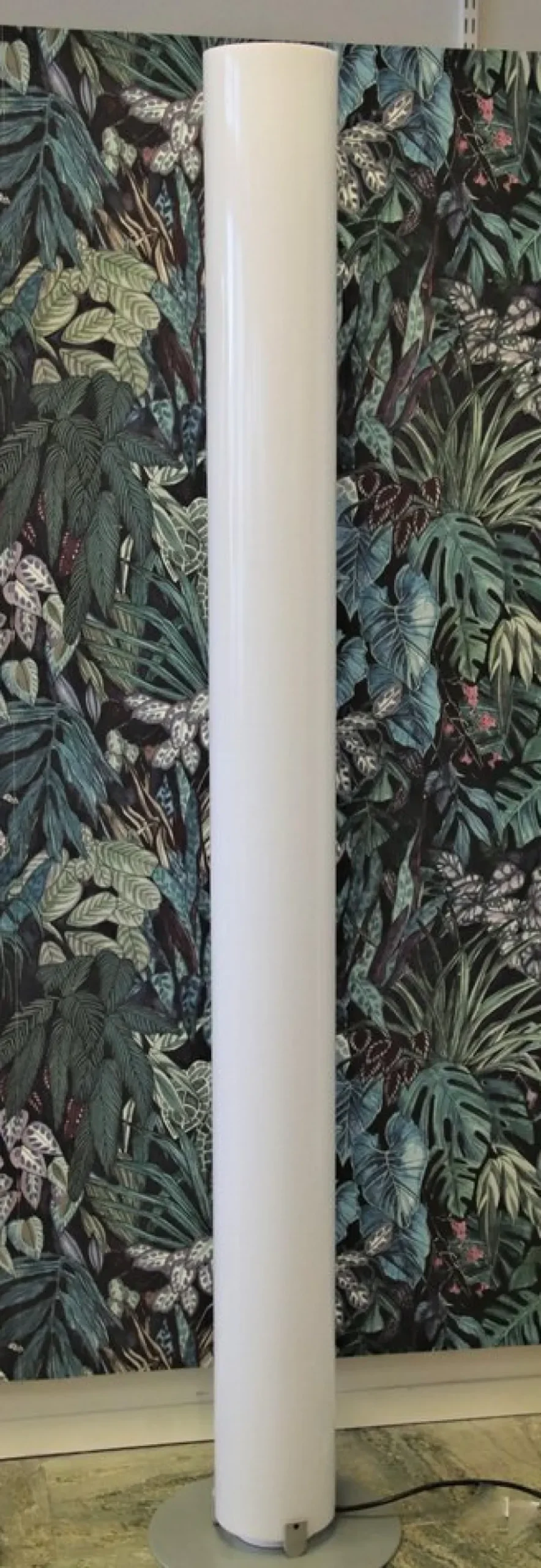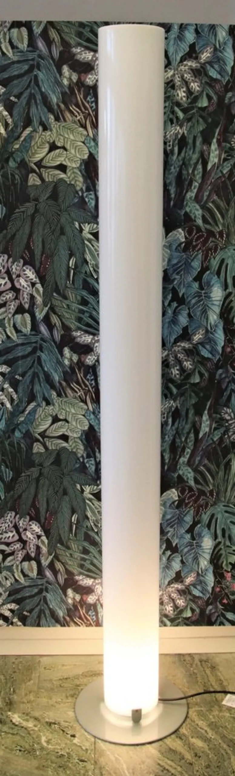 The cylindrical lampshade is made of white acrylic and is mounted on a powder-coated steel base.