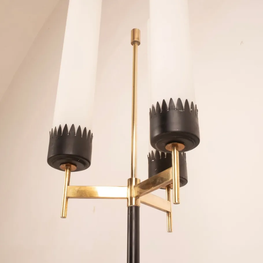 The floor lamp is in excellent condition, it rests on 3 iron feet enriched by a wooden detail and has a beautiful central support in solid brass which supports 3 lamp holders, complemented by 3 cylindrical opaline glass diffusers which give it a beautiful aesthetic and elegance.