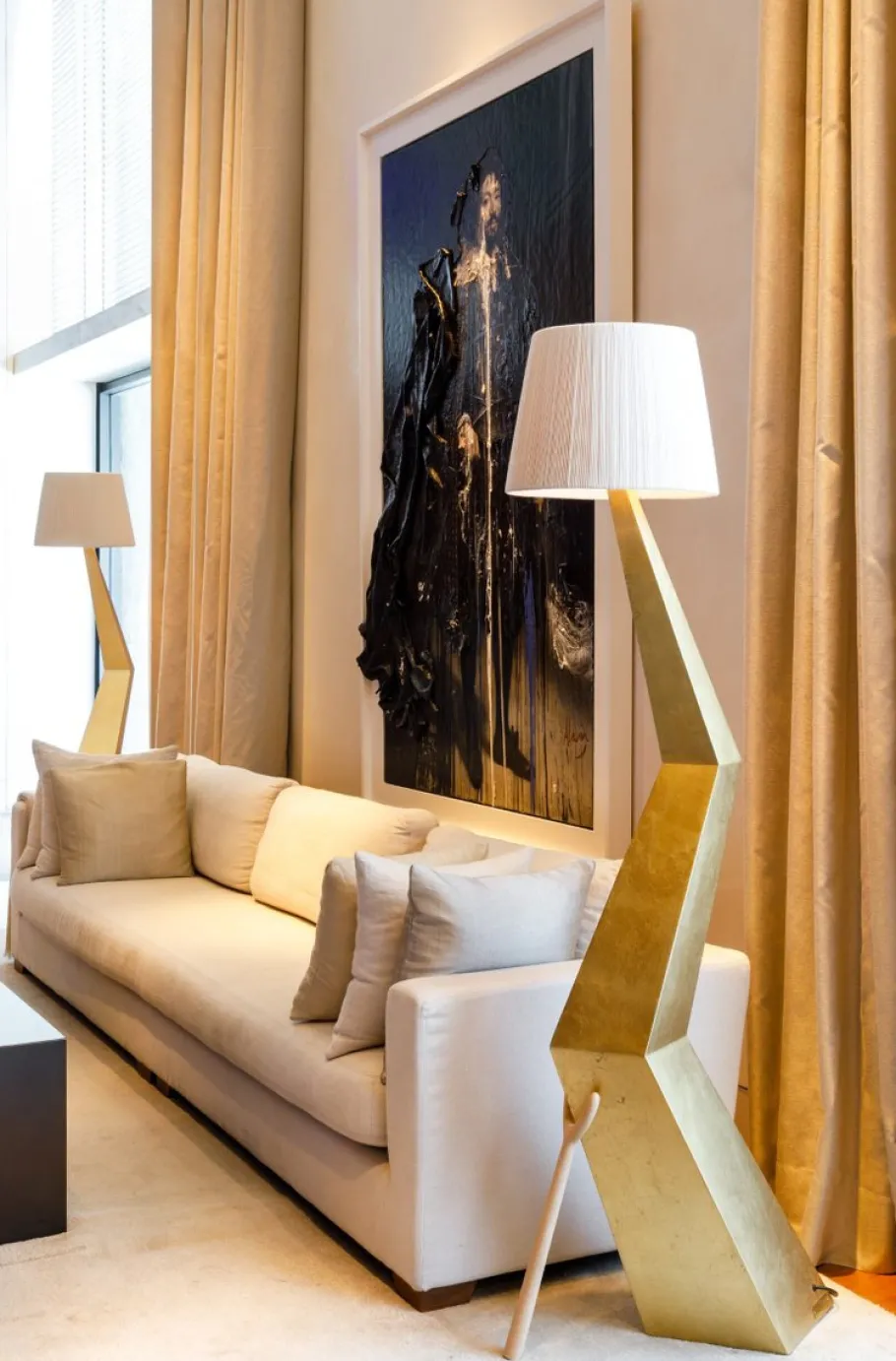 At its core is a striking zigzag pyramidal pedestal, meticulously covered in a fine gold leaf that pays homage to Dalí’s lifelong fascination with noble metals. This luminous base seamlessly supports a sculptural framework, crowned by a lampshade crafted from a blend of ivory cotton and rayon that diffuses a soft, warm glow—transforming any interior into a refined, ambient space.