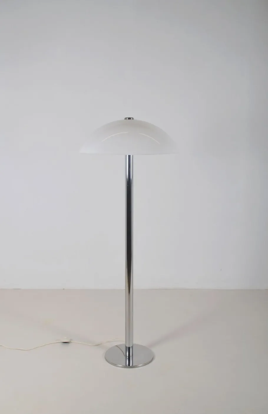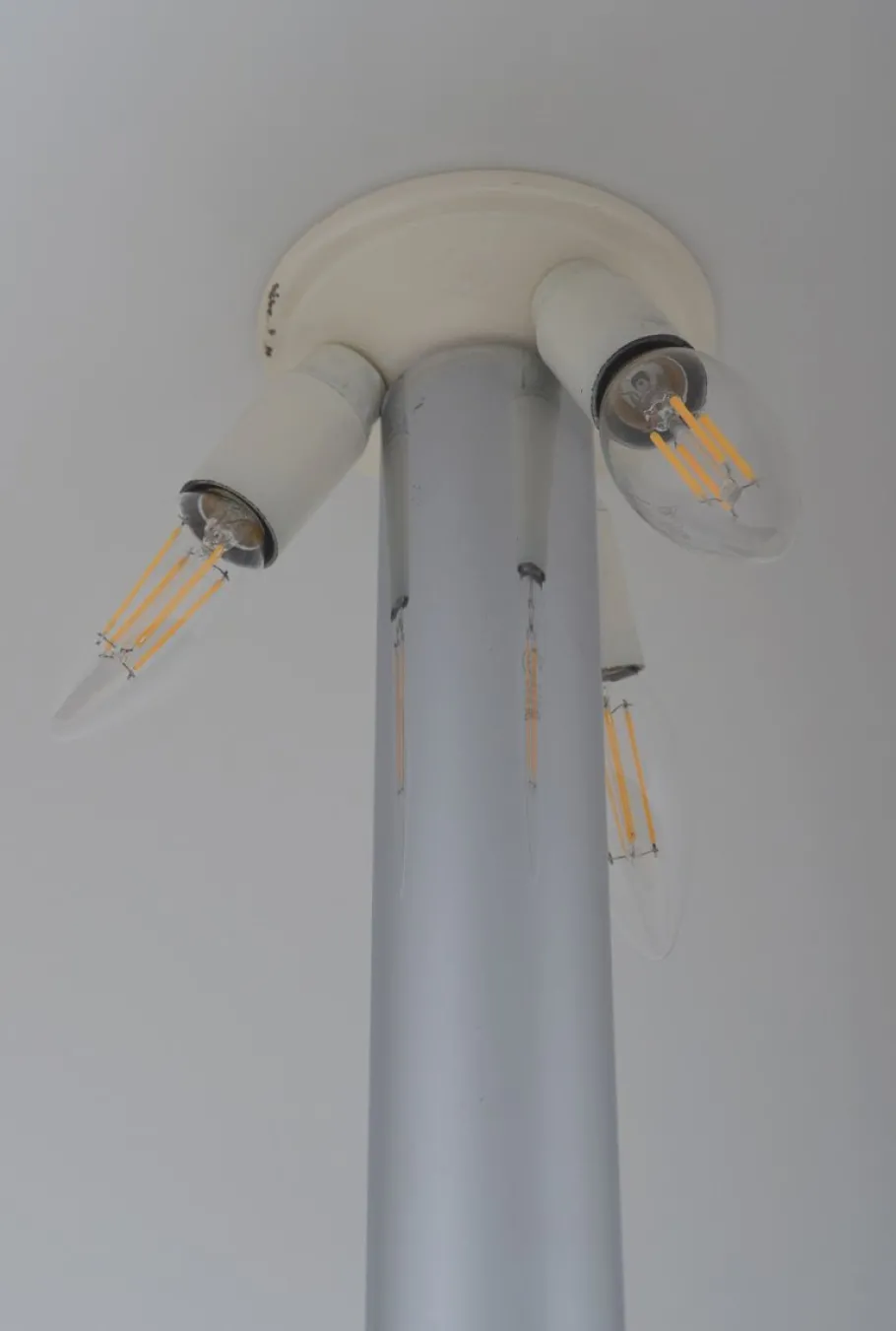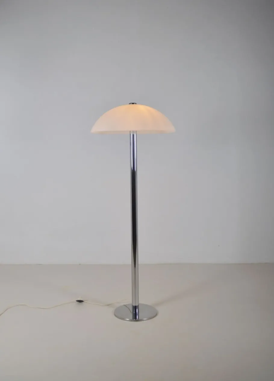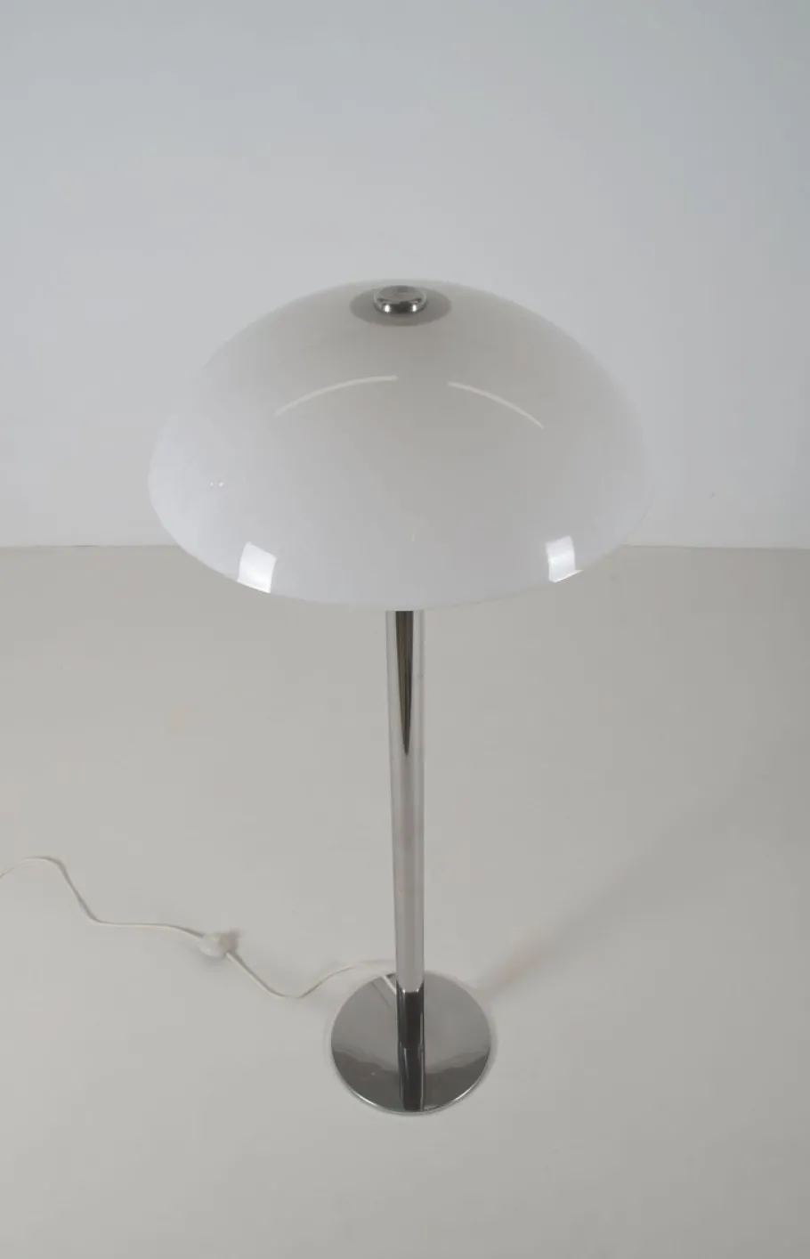 This designer lamp has a chrome-plated metal base that’s quite heavy, making it stable. Under the domed plastic shade, there are three light sources that create a pleasant ambient light.