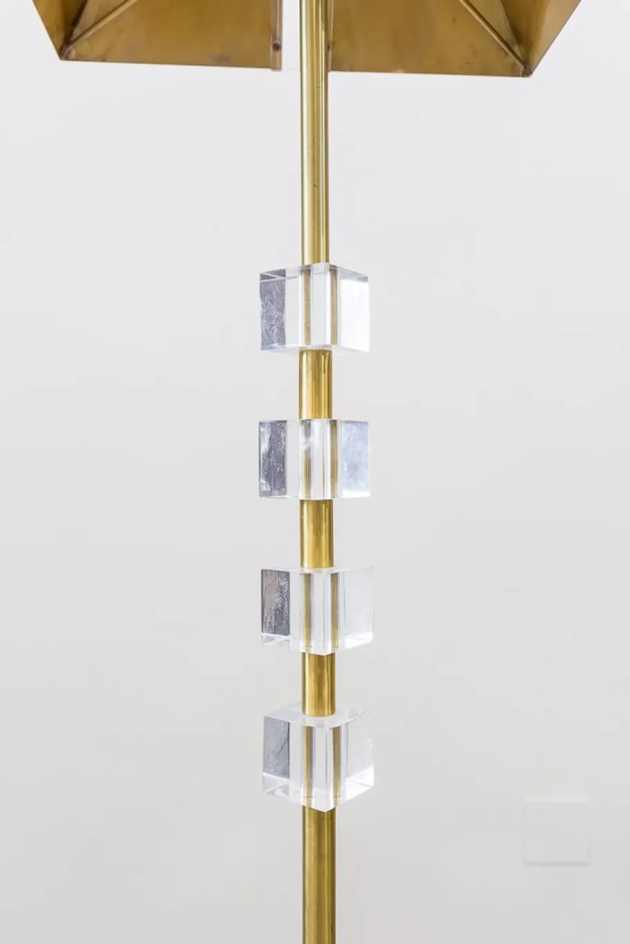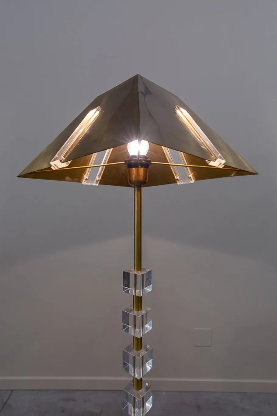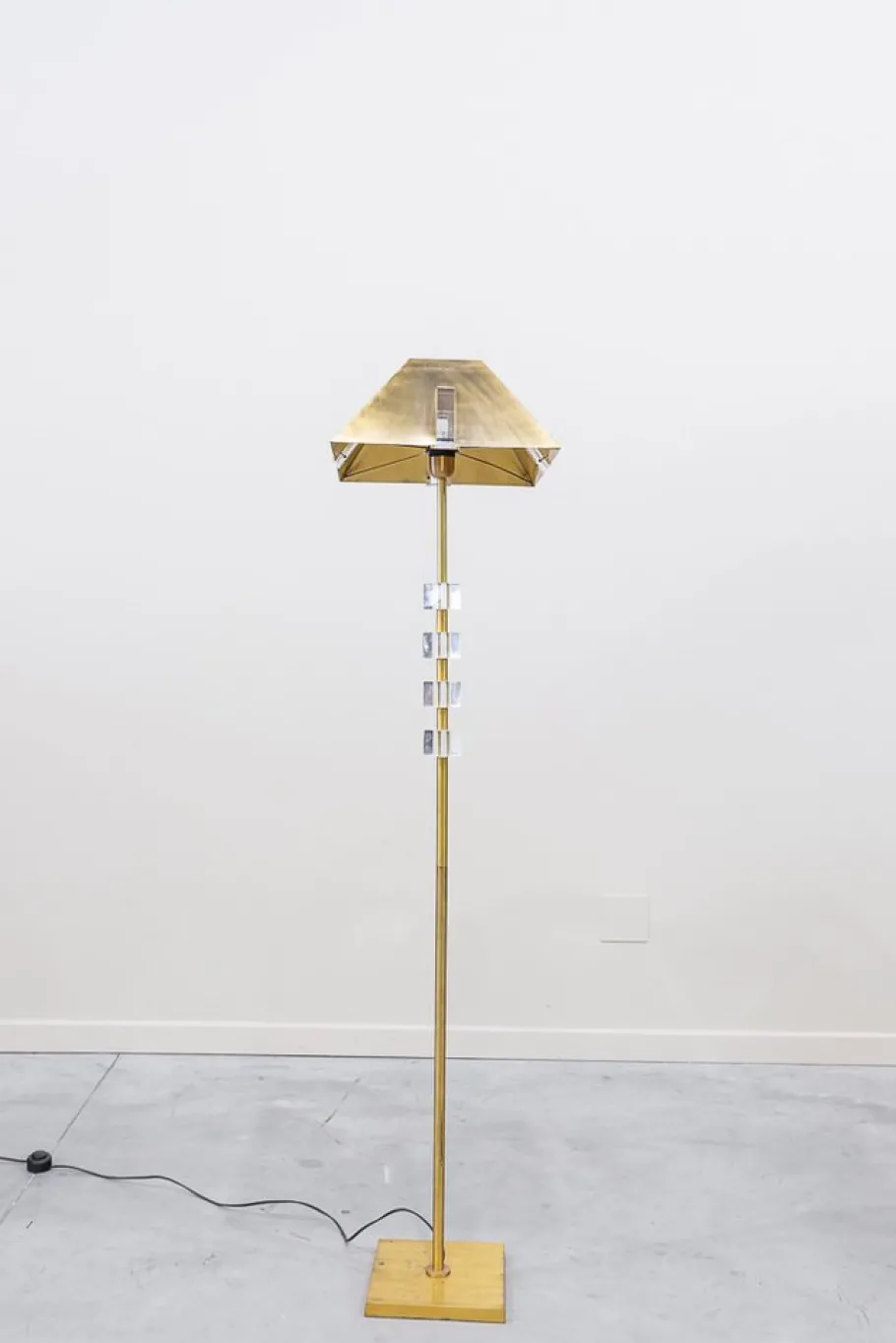 Cylindrical Fuste, on square base, with three metacrylate cubes on the top, a only light and screen, also brass, trunk -trunk with a rectangular embellish man of metacrylate in each of the four sides.
