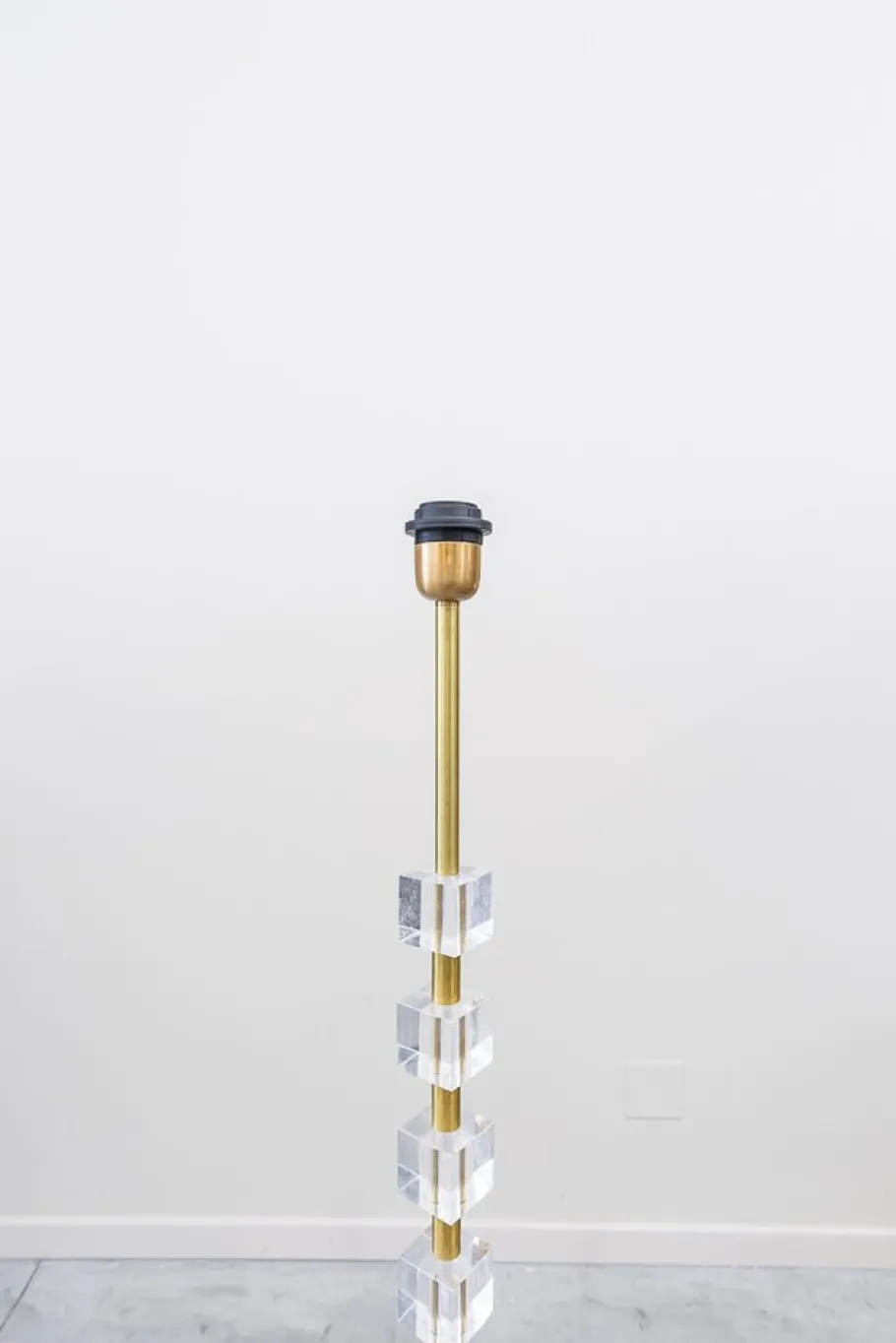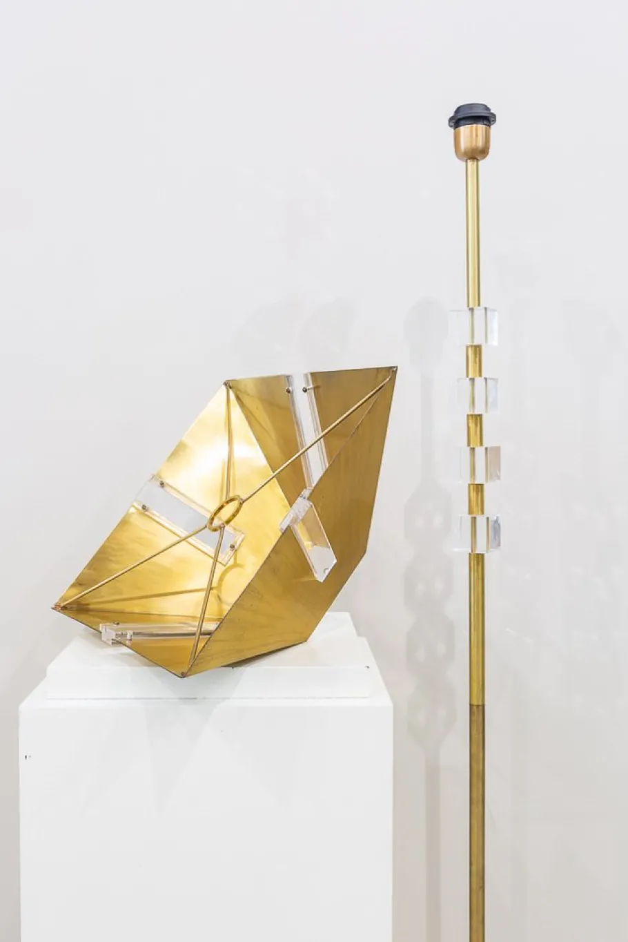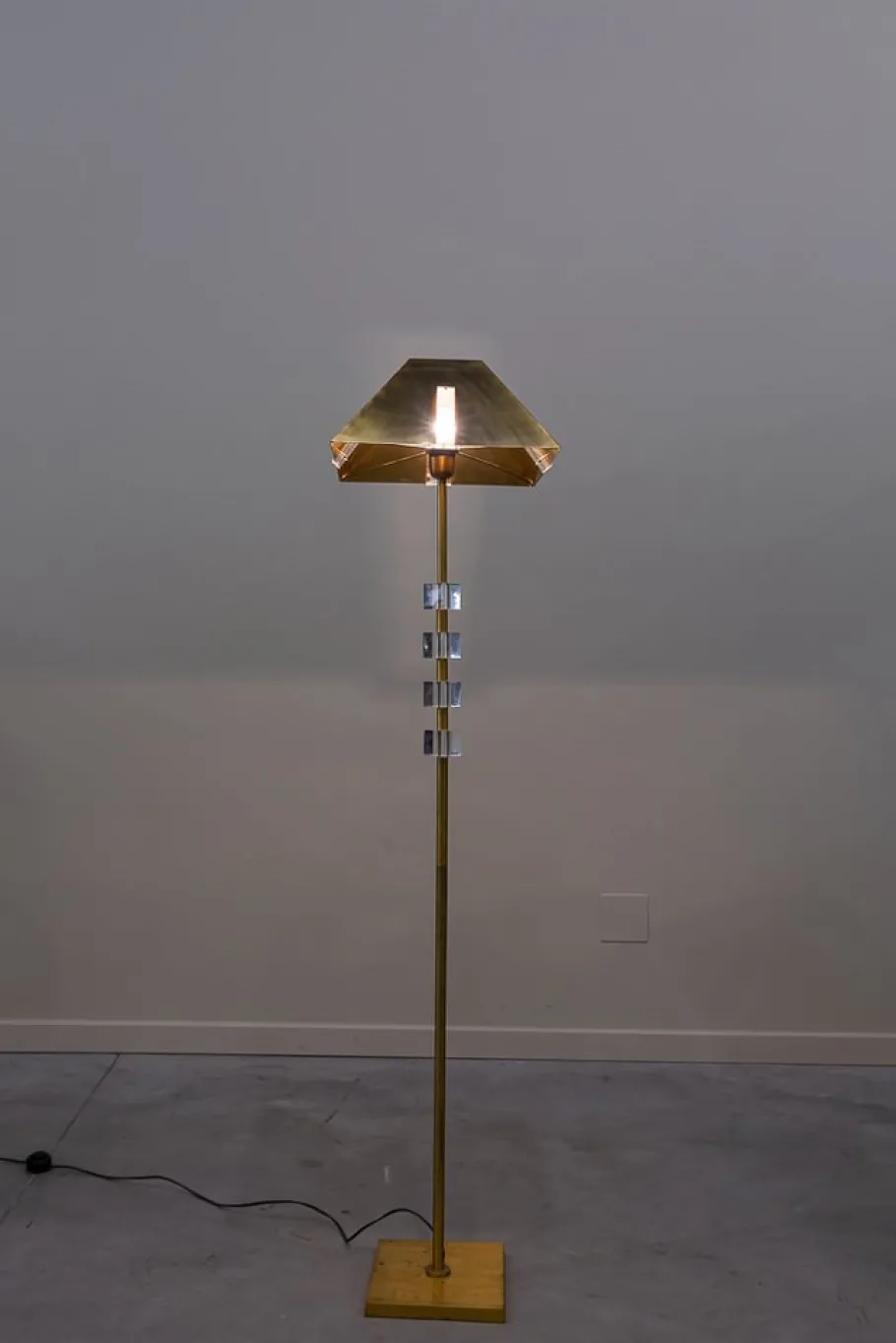Cylindrical Fuste, on square base, with three metacrylate cubes on the top, a only light and screen, also brass, trunk -trunk with a rectangular embellish man of metacrylate in each of the four sides.