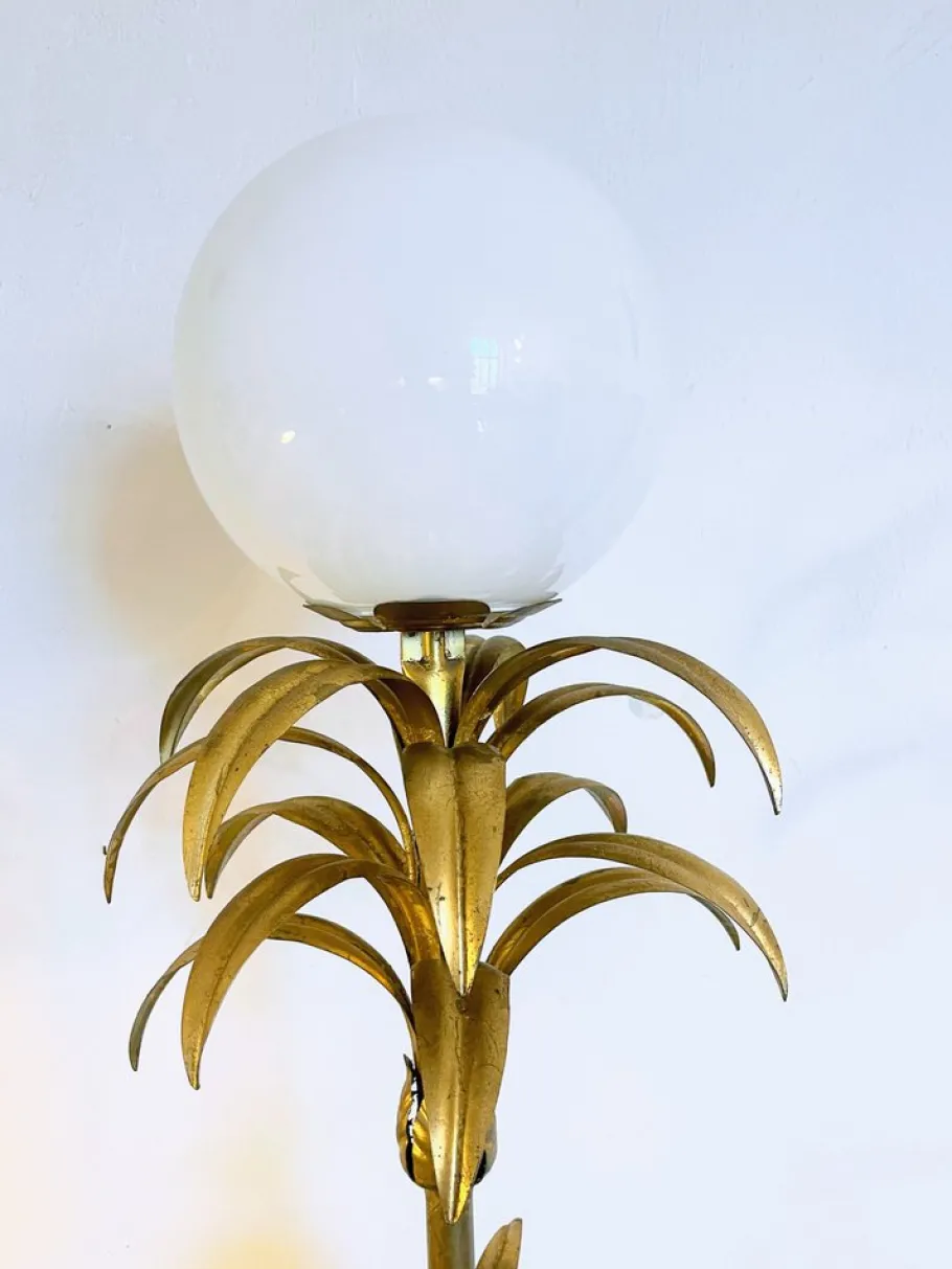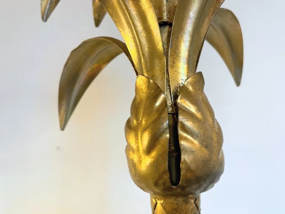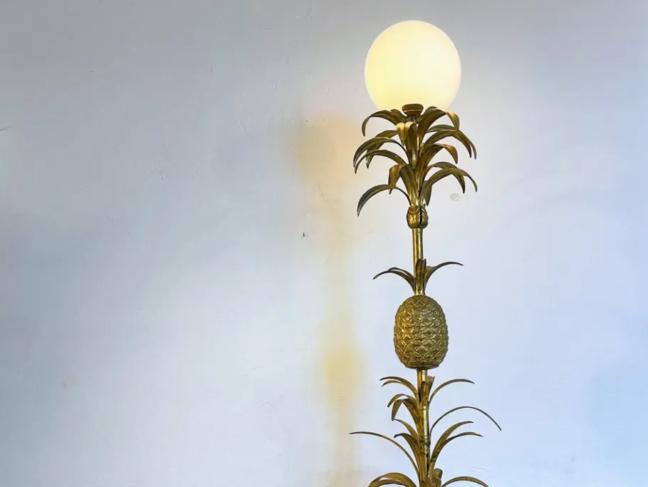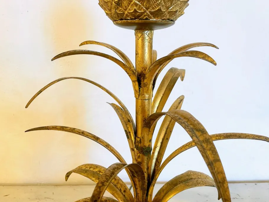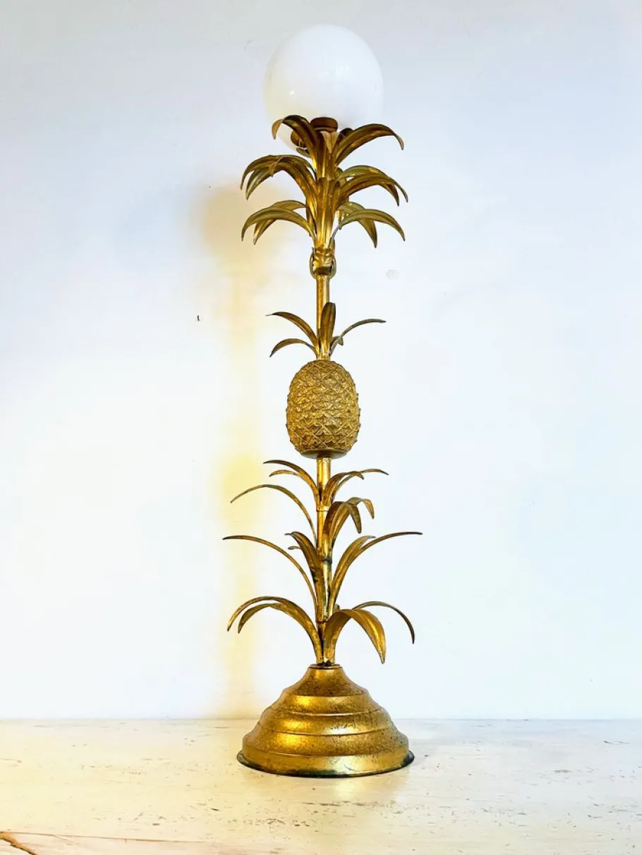 The exquisite gold finish adds a touch of warmth and opulence to the piece, staying true to the hallmark elements of Hollywood Regency style. The juxtaposition of the pineapple motif with a sleek glass lampshade creates a harmonious blend of materials, inviting a visual interplay between playfulness and clarity – a distinctive feature inherent in Hollywood Regency aesthetics.