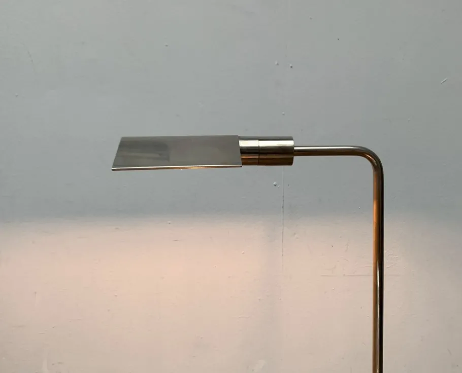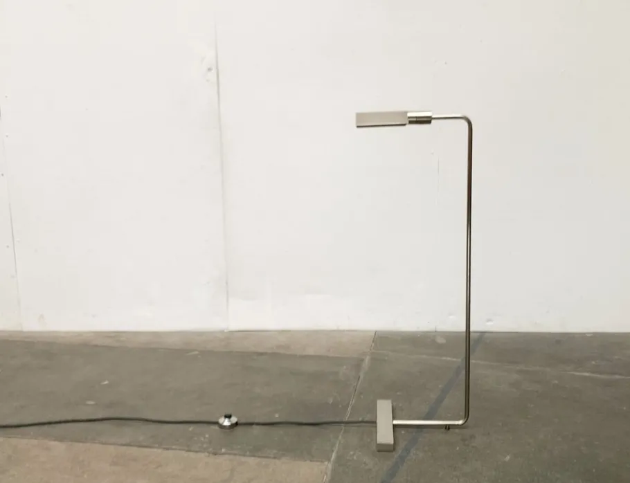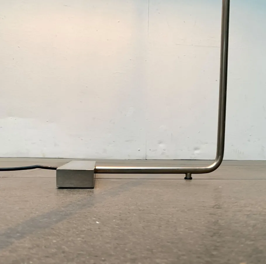 The design impresses with the fine execution of the details and the principle of cantilever and counterweight. It is strongly based on Cedric Hartmann’s standing lights. In details, such as the reflector head, even almost identical. The lamp has two poles that are connected to a double angled arm. The light head sits at the top. Opposite an elegant counterweight in the form of a massive block. The light screen can be rotated, the upper arm swiveled to control the direction of the light. The reflector is provided with a polished disc inside. The switch on the light head was replaced by a foot switch.