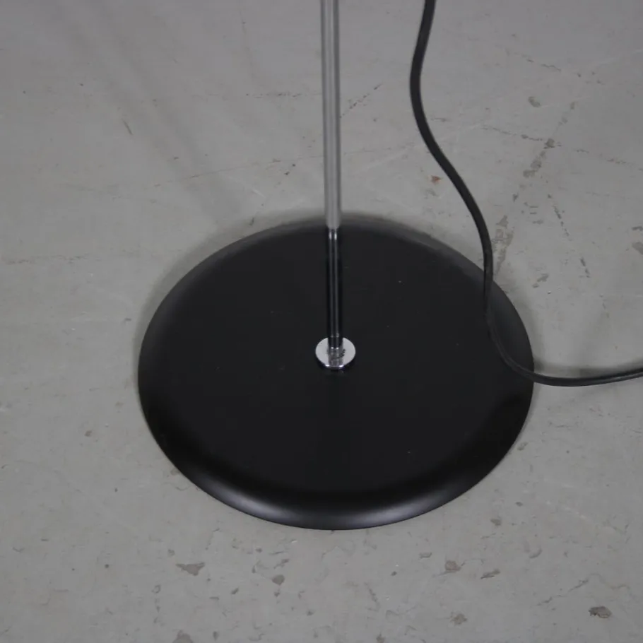 This striking floor lamp embodies the essence of minimalist design with its clean lines and sleek silhouette. It stands on a black lacquered round foot with a thin tubular chrome plated arm. The highlight of the design is the beautifully waved shaped adjustable hood, which adds a touch of elegance and functionality. The hood (and light source) can easily be adjusted in height by sliding over the arm. The combination of black and chrome finishes creates a visually appealing contrast, adding nicely to the iconic lamp’s overall appeal.