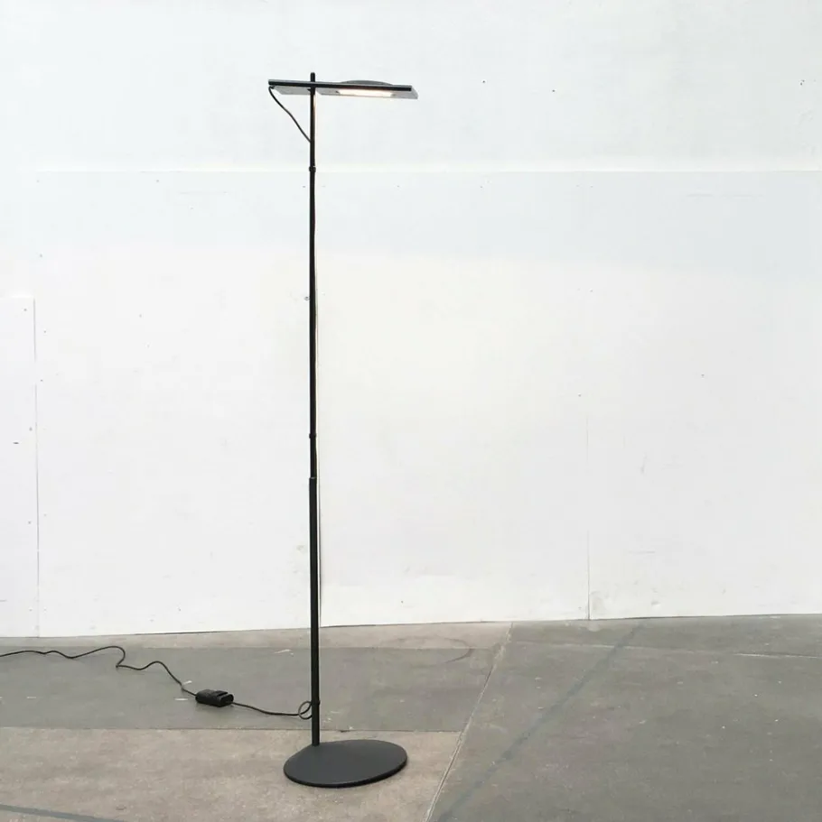 An elegant design from Italy. The actual luminaire body of the Duna is a flat, rectangular disc that sits at the end of an arm. The pane is slightly arched at one point. Together with fine slits on the surface, this bulge looks almost organic. A special detail lies in the elegant connection of the shaft and luminaire body over a gap. The black color of the entire lamp is also characteristic of the design. The light head can be tilted and the direction of the light can be adjusted individually. from the ceiling flood over wall light to the reading light. The lamp is adjustable in height. The shaft can be easily pulled out. The striking foot and the lower part of the shaft stand out with a matt structural lacquer from the rest of the lamp.