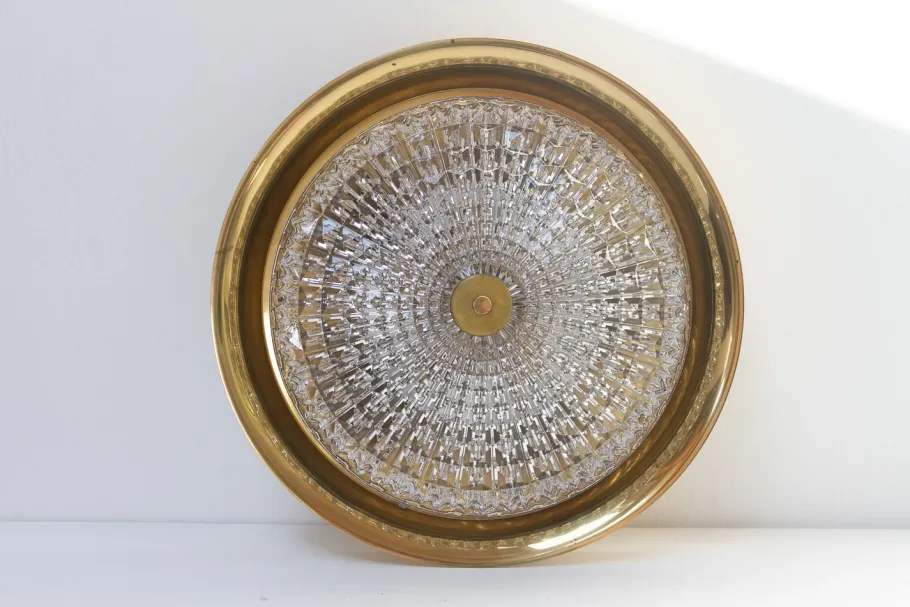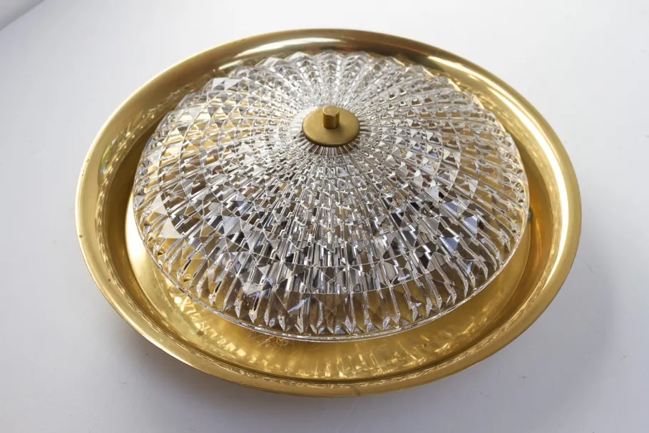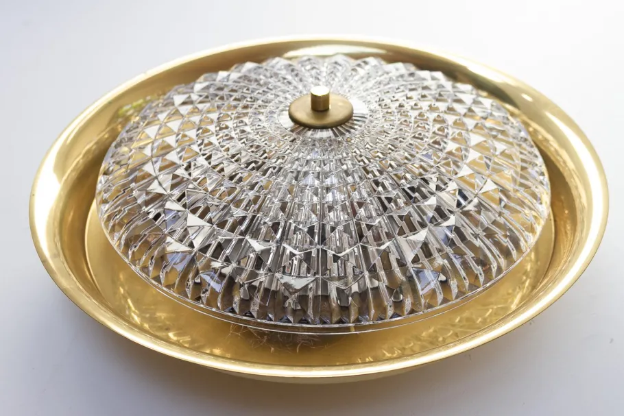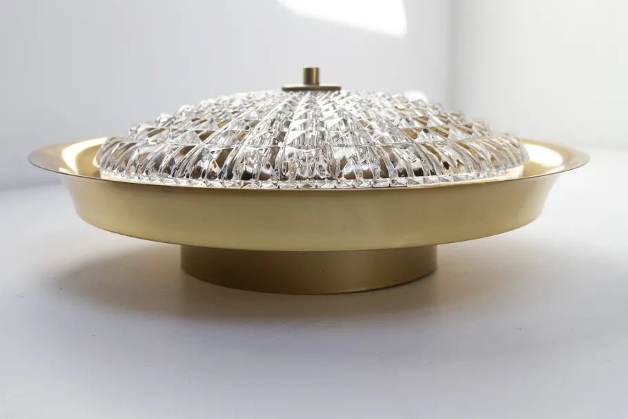 Scandinavian Mid-Century Modern light with clear textured thick crystal shade and brass body. Emits a beautiful refracted light through the crystal glass.