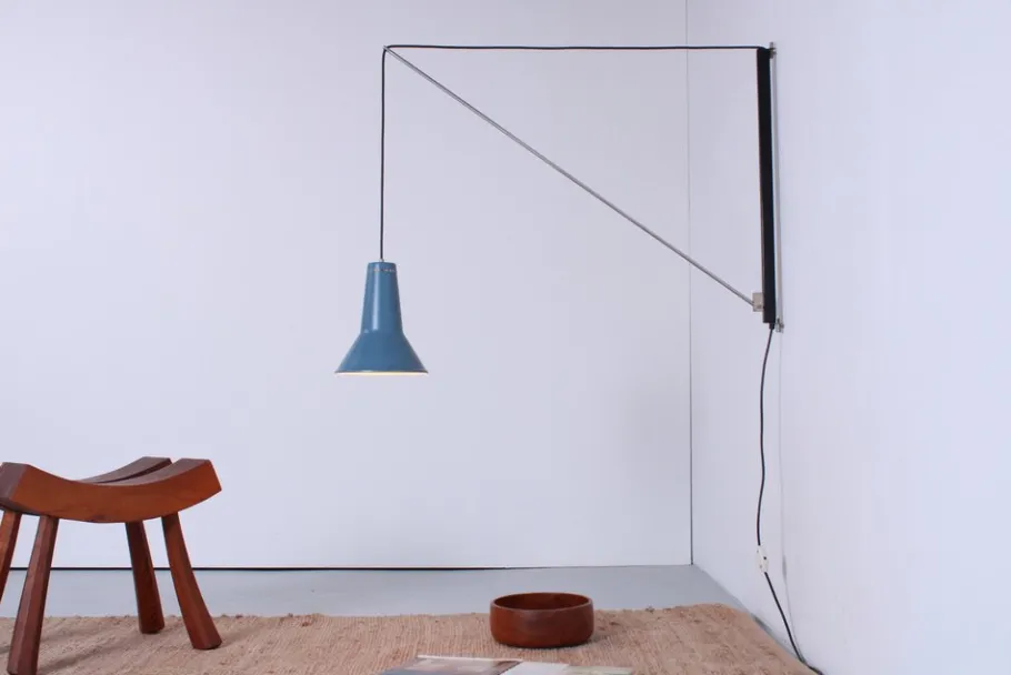 Thanks to the swinging arm suspension the light can be move from left to right from the wall. Documented in 1950ies Goed Wonen catalogue, pg 87. The fifties Hagoort designs are clearly influenced by the designs of Anvia, Stilnovo and Asea.