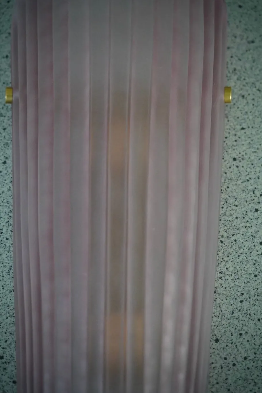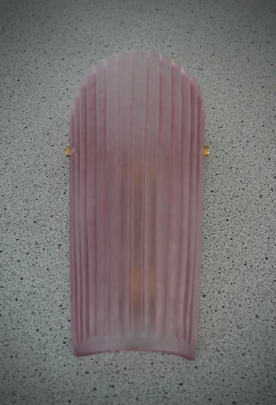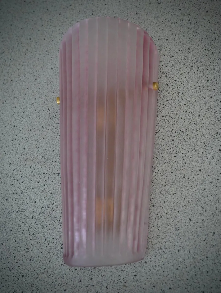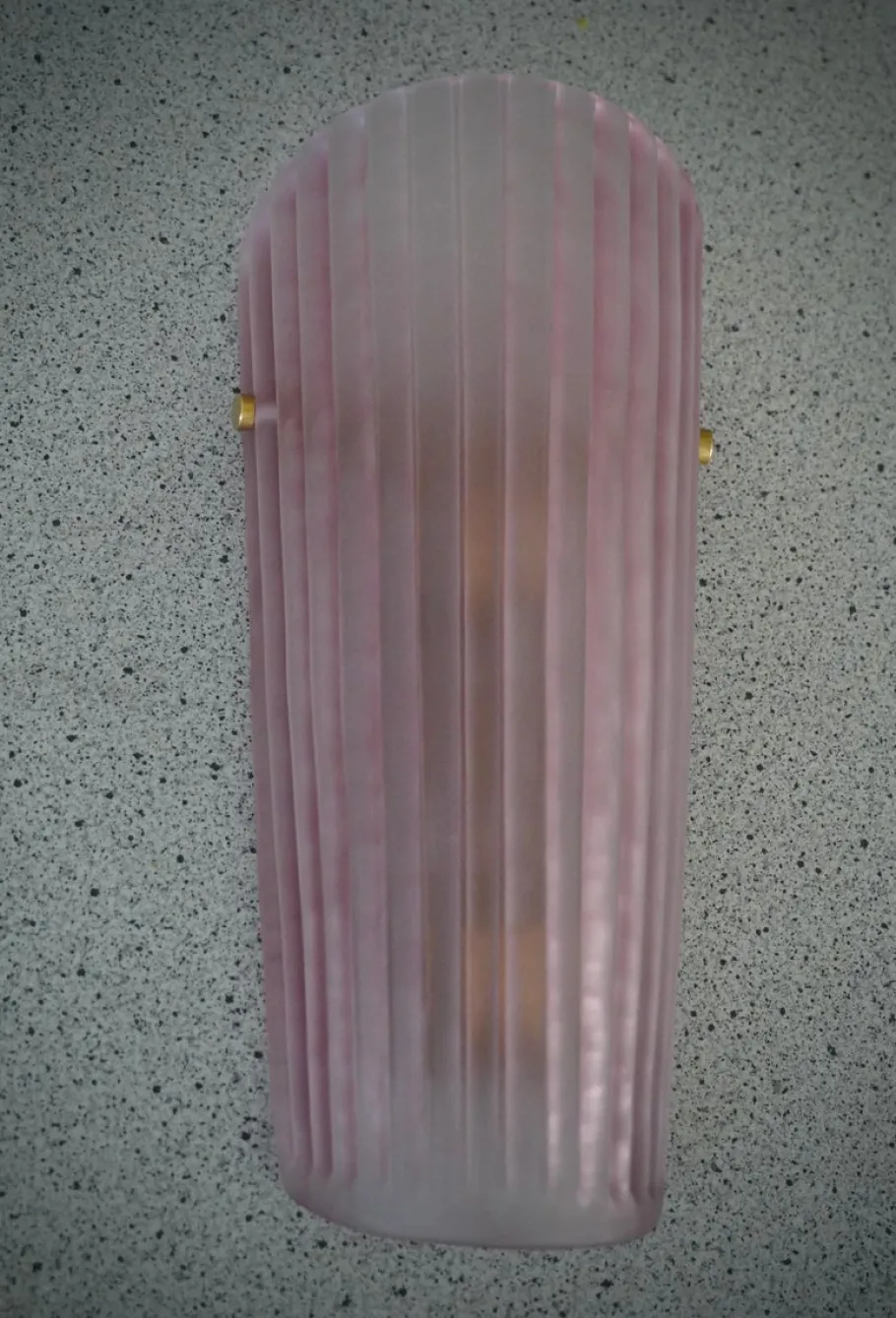 The applique is composed of a beautiful striped and curved glass to form a semi-cylinder. The glass has been sandblasted and acid-etched, taking on a pink color, very beautiful and resistant. Along the height of the applique there are ribs, which make the applique even more beautiful in its design; the fixing is done with two brass screws. The structure to which the glass is fixed is gold colored and the two lamp holders are gold colored. Refinement and style as in the style of Murano glassworks, unique pieces of their kind and pieces that always remain precious. Once turned on, the applique is very bright thanks to the two lamp holders, it will illuminate your home perfectly.